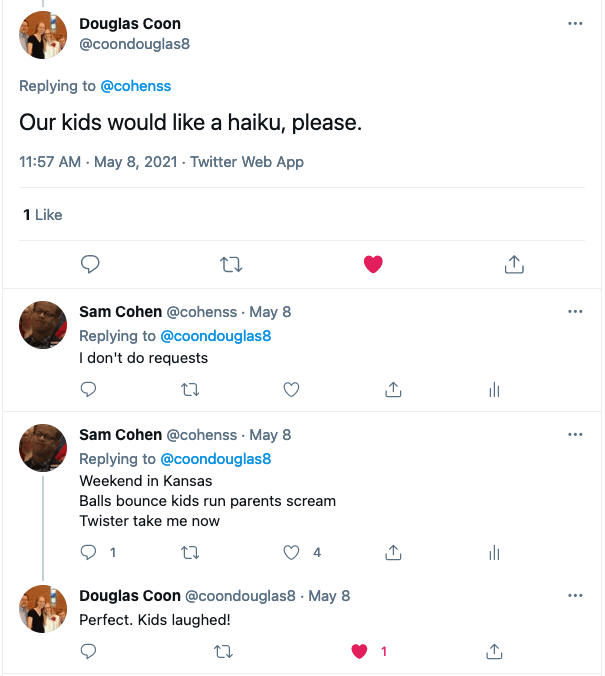 … so there’s that. It’s not you, world, it’s me, or the length of the season, of the semester, and/or of the legislative session. And I don’t edit these things, they just pop out on Twitter, so the mood they got written in is the mood that shows up in them. I will also note a personal tendency in these most recent poems, which I think is more pronounced than in past ones, or maybe I’m just hiding it less, and certainly no one cares either way. I’ve got grading to do and something to write for someone about the aforementioned shit show in Jeff City, so here are the poems, which are supposed to be just for fun anyway, yes?