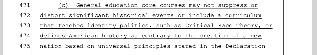 This part is a masterpiece of bigotry and incoherence. “[…] a curriculum that teaches identity politics, such as Critical Race Theory, or defines American history as contrary to the creation of a new nation based on,” &c.? These people want to tell other people what they can teach when they can’t even be relied on to construct a sentence that doesn’t collapse in a gentle warm breeze such as you might find on the shell-strewn beaches of Sanibel? But the bigotry somehow shines through like blazing, myeloma-encouraging sunshine through a thin, sticky coat of Hawaiian Tropic.