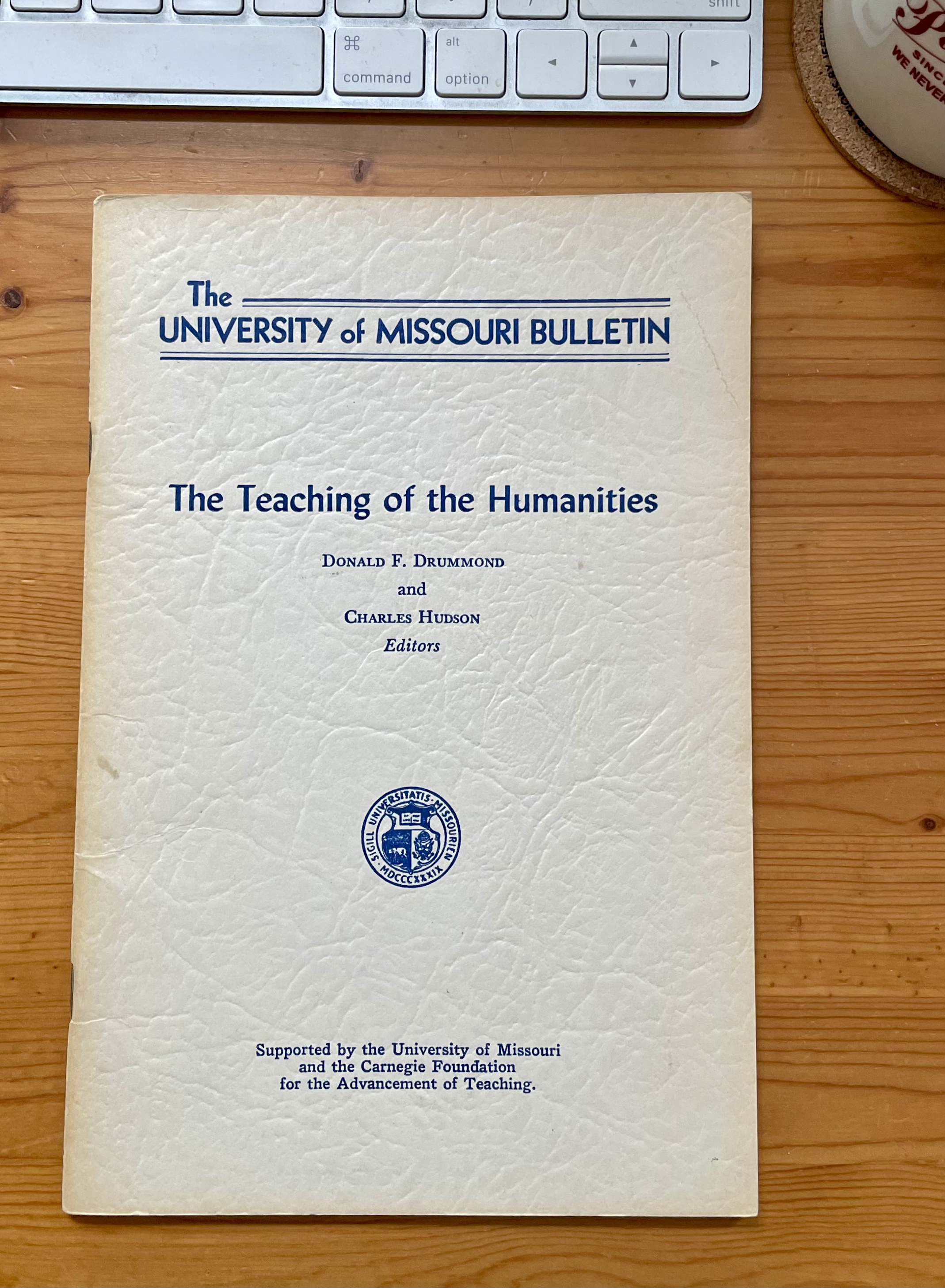I found this report at an estate sale a while ago. It was published seventy years ago by the University of Missouri (where I may or may not work, who’s to say). It’s a report from a three-year series of conferences on humanities teaching funded by the university and by the Carnegie Foundation for the Advancement of Teaching.