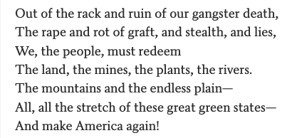 So you won’t catch me watching a parade or wearing red, white, and blue or blowing shit up, but I won’t criticize people who do those things if they do them in ways that say Yay, America, let’s keep working on this jawn, rather than We’re #1 except we’re a hellscape because of all of these migrants/gays/liberals, &c., so let’s get rid of them. Tomorrow I will grill hot dogs and drink something and see if I can renew our passports online or if I have to mail them in, no reason in particular, nothing to see here, move along. And I will read this Langston Hughes poem like I do every year (like I read Philip Levine on Labor Day, because I’m a simple soul), because it says this: