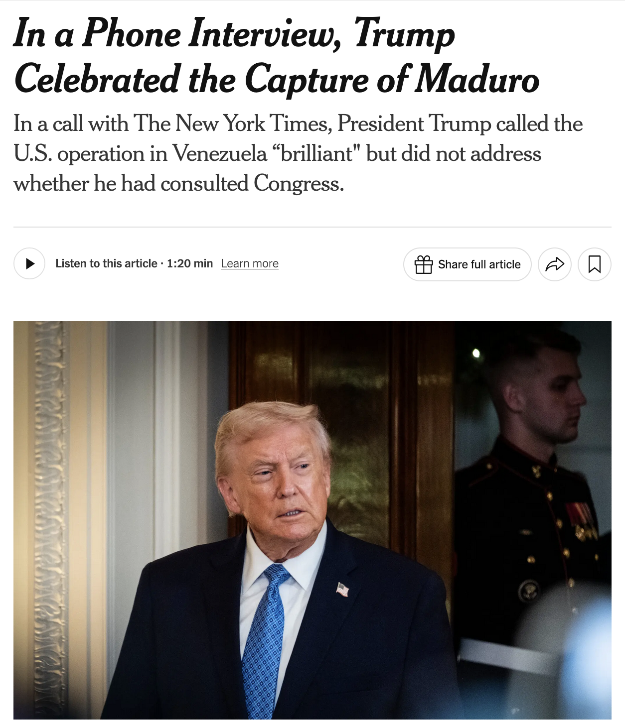 So we woke up today to learn that we’re kidnapping people outside the US now too. The president and whoever was the last person to talk to him decided to attack Venezuela because of drugs, oil, democracy, domestic politics, unresolved daddy issues, FIFA peace prize, whatever. And he didn’t ask Congress because only people who know or care how things are supposed to work would do that.