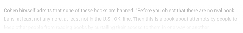 Needless to say, our book isn’t a novel (I imagine this is not the author of the op ed’s fault, but it’s somebody else’s fault that this headline has been up for days). And it doesn’t “blast” “liberals.” It’s a collection of essays about attempts to keep certain books away from certain people. To the author’s glee, I write in the preface that we don’t ban books in the US but we use the phrase as shorthand for efforts to curtail access to books short of official government censorship. Saying this is not the same as admitting the whole thing is a hoax. In fact, when I say it, I say it in a way that someone reading in good faith would have to note is responding to exactly this kind of gotcha. (Please forgive the fading behind-the-paywall print.)